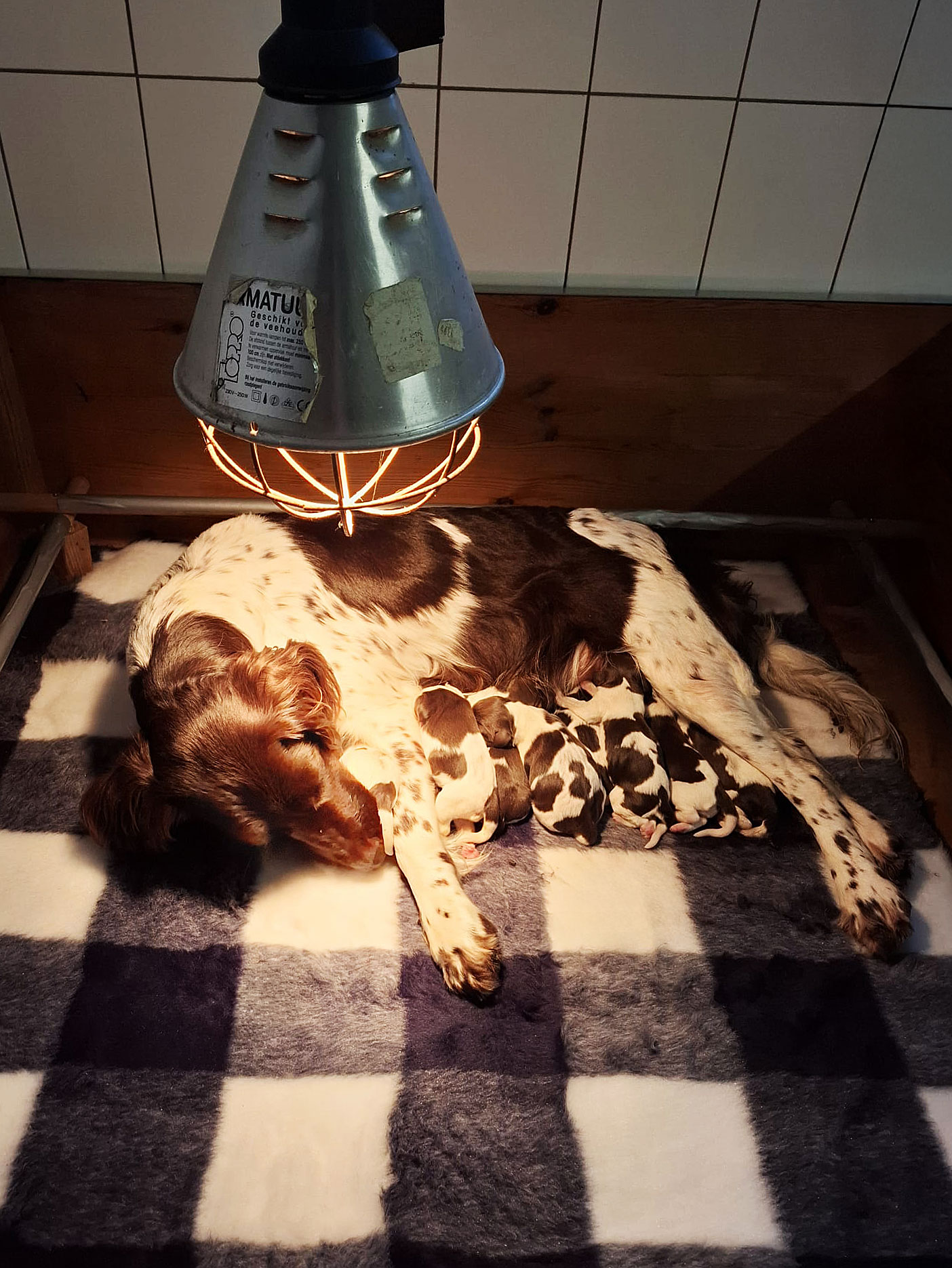 Moeder en pups maken het goed en alles is voorspoedig verlopen. We zijn ontzettend trots op Vica en dankbaar voor dit mooie, gezonde nest.